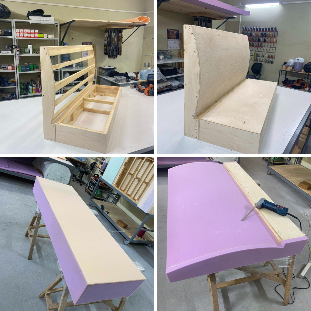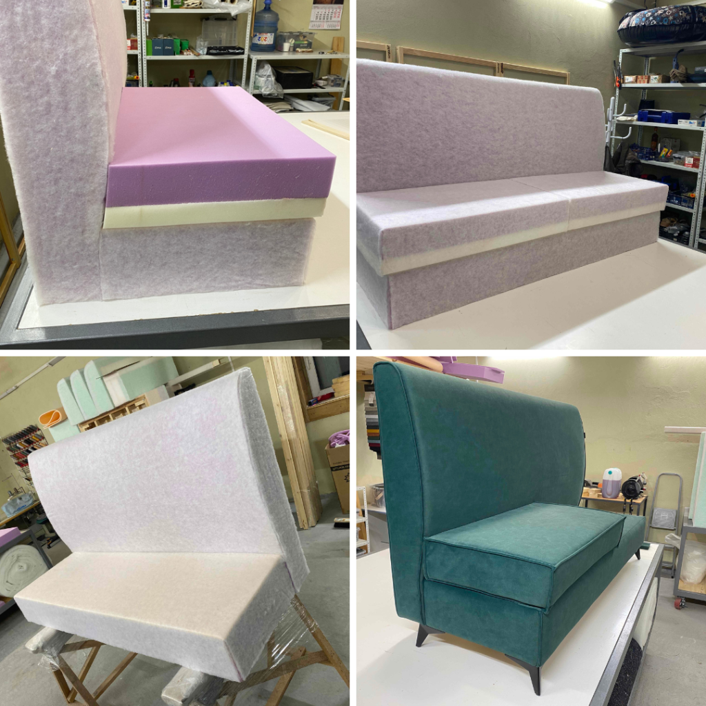 Для обеспечения комфортной сидушки и спинки мы используем поролон различной толщины и плотности https://simpla.by/katalog/porolon/. Важно также обратить внимание на плотность поролона — чем выше плотность, тем дольше он будет сохранять свою форму и обеспечивать поддержку. Для спинки взяли поролон 20мм плотностью 2842, обеспечивающий мягкость и оптимальную поддержку. Для достижения лучшего комфорта на боковые части и верхний слой спинки применили поролон 30 мм аналогичной плотности. Сидушка с использованием поролона толщиной 50 мм плотностью 3245 и дополнительного слоя в 100 мм плотностью 2842 будет отлично распределять нагрузку и обеспечивать удобство. Для защиты поролона от механических повреждений и помощи сохранить форму используем синтепон, который служит отличной подложкой между поролоном и тканью.