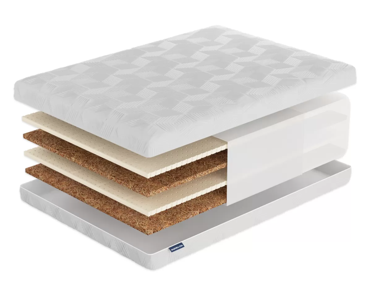 Кокосовая койра придаёт необходимую жесткость матрасу, а натуральный латекс в свою очередь смягчает поверхность, делая её сбалансированной и комфортной для здорового сна как взрослого, так и ребёнка.